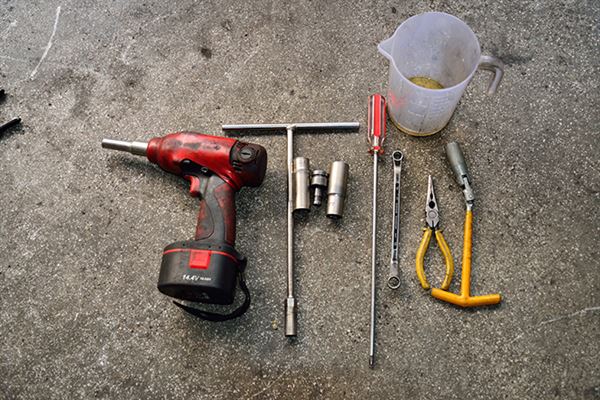 本次所準備的工具有12㎜T把、尖口鉗、長一字起子、10&12號梅花扳手、電動把手、17、19號套筒、火星塞套筒、尖嘴鉗及量筒、漏斗等,除了用來拆除傳動的電動把手價格較貴之外,其它都是非常容易取得的工具,請有興趣的讀者也可自己動手一作,體驗DIY的樂趣。