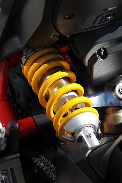 後避震器採用Öhlins出品的全可調避震器,整體長度相當驚人,不僅作動軟Q,騎乘舒適表現上也相當搶眼。要是覺得騎乘的時候有點偏硬的感覺的話,建議將避震器設定得稍微軟一點會比較好騎。引擎的傳動皮帶外蓋採用碳纖維材質、缸頭蓋則是採用鎂合金材質打造,引擎本體雖然跟標準版相同,但實際上卻配備了一些有助高轉表現的SP版獨門配備。