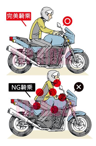 如果騎士朝後輪接地點的方向分配重量時,可以感受到輪胎的抓地力,提升安心感,讓摩托車順利過彎。訣竅就是向後就坐,停車時為了置腳性可以再向前移動沒關係,一旦開始行駛後記得要重新坐回到後方
