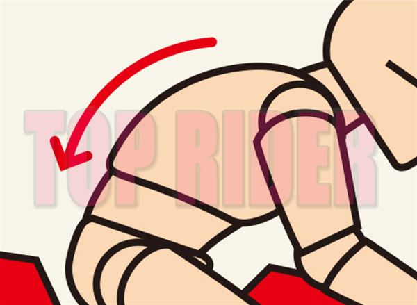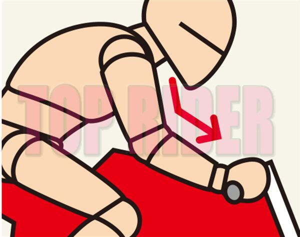 膝蓋夾緊油箱雖然有助於支撐身體,但過度施力的話反而會有損人車一體感,所以必須要學習放鬆力量的方式,只要向後就坐,將肚臍吸入小腹,指尖朝前的話就OK了