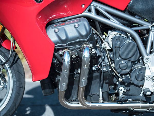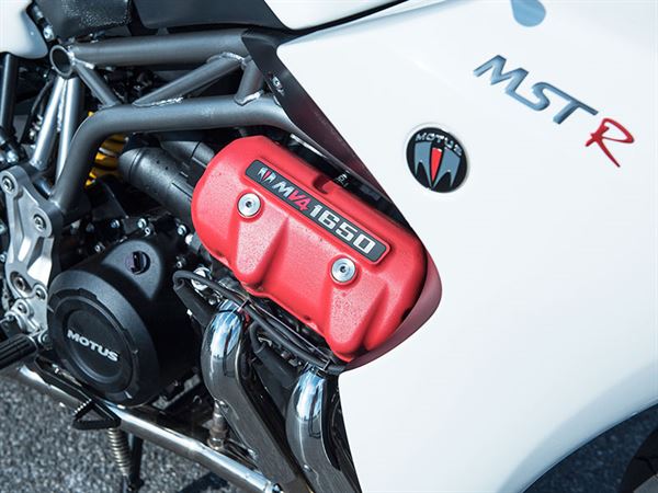水冷V4 Baby Block OHV引擎配置與HONDA ST1300的方式相似,缸徑為88mm行程則是67.8mm,排氣量剛好1650cc,引擎壓縮比11.5:1。而75º角的曲柄設置呈現出MOTUS專屬的引擎型式,裝載在V型汽缸之間的單滾輪凸輪軸漂亮的展現出美式Detroit風格。MST-R的引擎性能和標準版有許多不同之處,零件設計上換成增升的凸輪軸設計,引擎眏射也重新調整過,轉速紅線也比標規多了400rpm,MST紅線約8,200rpm。
