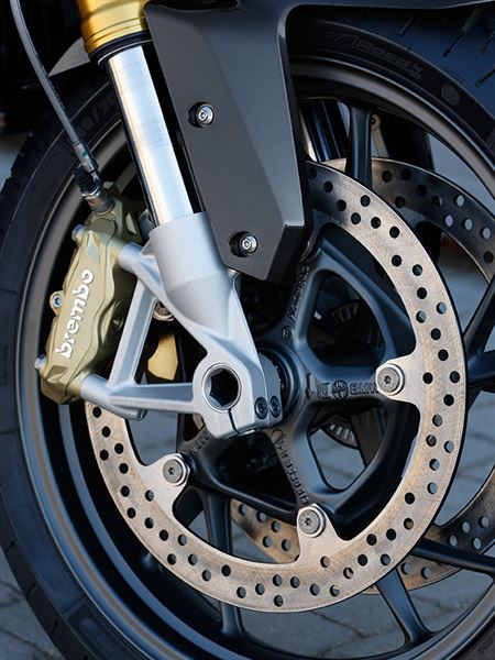 接著就是前制動系統部分採用Brembo輻射對四卡鉗再搭上前320mm後276mm浮動碟盤。切換式Bosch ABS防鎖死系統也是標配,而且在濕滑的道路上效果相當好。