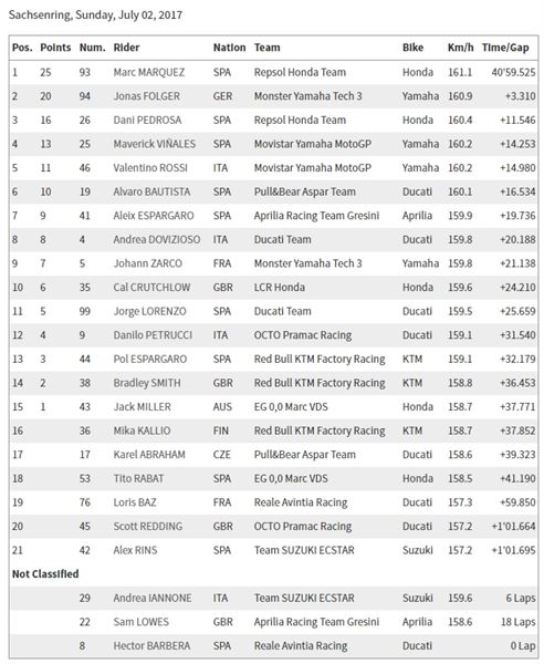 德國賽道的無冕之王Marquez果然不是浪得虛名,從起跑後大部分的時間就待在第一名,值得驚豔的是地主國騎士Folger一路緊追在後給予不少壓力,並且還曾經領先過一小段時間,雖然最後只有第二名也讓德國觀眾大呼過癮,也是好幾年來第一次在德國站有地主騎士站上頒獎台。其餘成績如下。