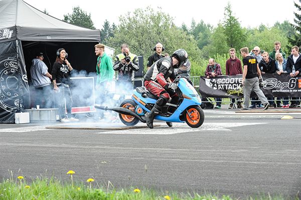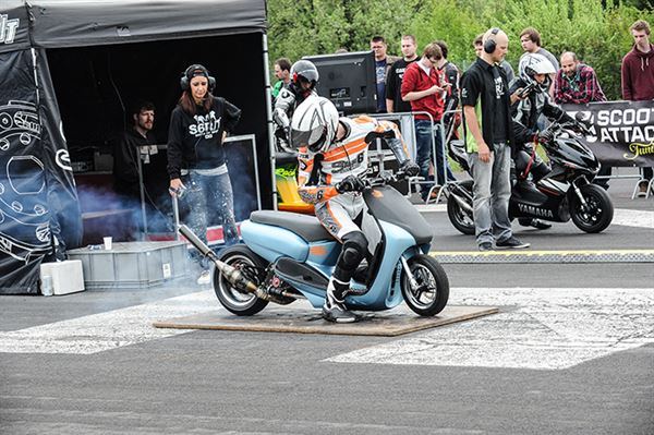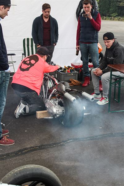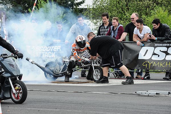 和一般道路賽車不同的是,直線加速賽並沒有暖胎圈,在車輛動力極強的設定下,後輪不能如此一般速克達的輪胎,否則會抓不住地面而打滑,重點就在於抓地力,如果起跑瞬間打滑那就篤定會輸了,所以燒胎主要是為了讓輪胎快速達到工作溫度確保抓地力,而過程中輪胎的燒焦味及煙霧,以及引擎高速運轉時的噪音、藍煙及刺鼻味,都能讓帶動全場氣氛。