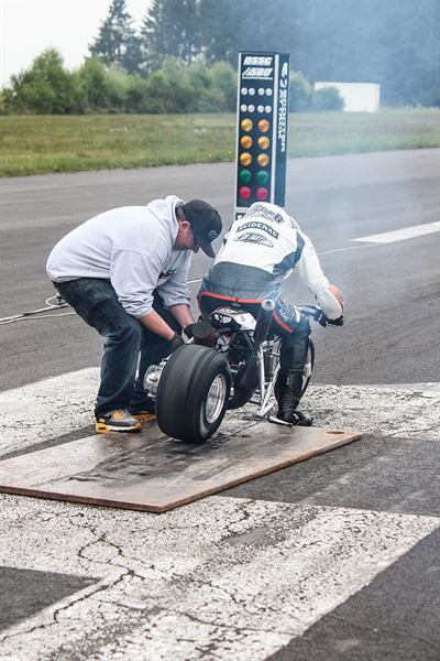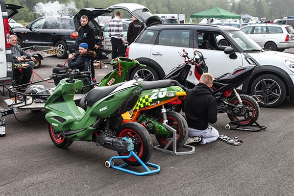 直線加速賽由於引擎只需要運轉極短的時間,因此校調時能有多緊繃就多緊繃,也因此常常能看到車隊當場就在拆裝引擎,尤其如果決賽前有數次練習等行程,所有車隊跑完就拆的盛大場面是司空見慣的,但也拜二行程引擎拆裝簡單之賜,在現場無論要進行修復或是在調整都不會是問題,時常也能看見選手自己跳下來一同調整車輛的有趣景象。