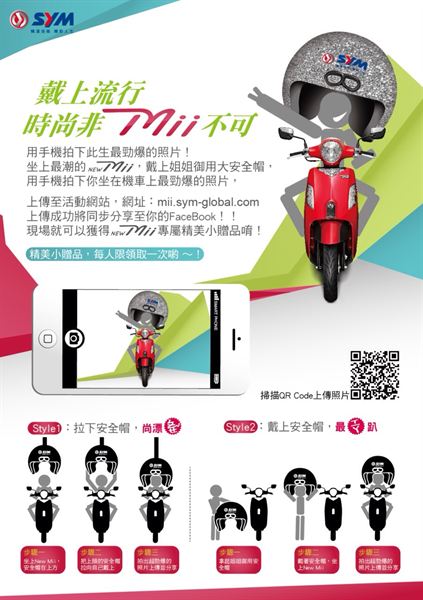 你是不是也很想體驗頭戴「炫眼大安全帽」,坐在「美力全能的new mii」上拍下這特別的一刻呢,現在三陽SYM實現你的夢想,讓你一嘗與姊姊謝金燕同樣的享受!快到下面的活動地點,參與這特別的體驗吧~