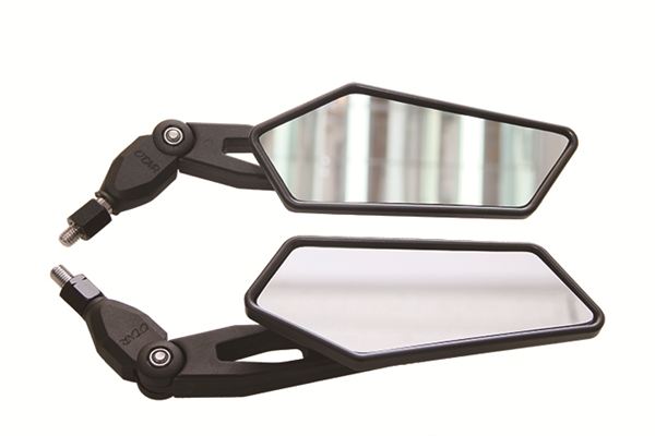 駕駛人在騎乘時,需要隨時注意後方狀況,所以後視鏡真的是不可或缺的。目前,市面上有許多特殊造型的後視鏡,如閃電、火焰造型等,其實此類後視鏡的可視範圍非常小。騎乘中除了正後方的死角之外,後視鏡約略斜後45度至30度就是其視覺死角。如果鏡面越小越複雜,視覺死角則越大。建議車友們在騎乘時,適時地擺頭、左右觀看,消除後視鏡的視覺死角,才是道路安全的上上策。