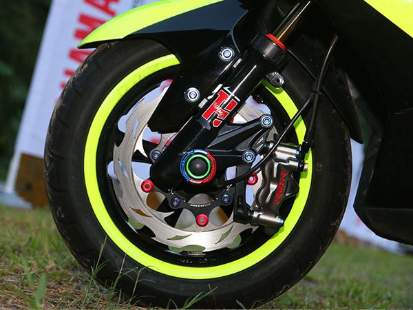 螢光色系的車款可以算是常見的的改裝車選用色了,不過此台S-MAX將車色與其他組件搭配得相當出色,彼此相輔相成誰也不搶誰的風采。螢光色與黑色的雙色搭配和拉線,不但不讓車色過於單調煩膩,更有無限延伸的視覺感官。在部件上,車頭安裝了車燈鬼面罩與經過髮絲紋貼膜的大型風鏡,讓車頭呈現非常壯碩卻自然的感受,駕駛介面上使用了多色的CNC加高冠座與MVJ可調拉桿點綴,輔以燒鈦色螺絲的配合,讓車把部分成為了整車的重點視覺之一。另外在風扇蓋上做圖騰貼膜,也使後總更有看頭,整車的改裝幅度拿捏恰到好處,展現出完整成熟的精緻視覺加工。
