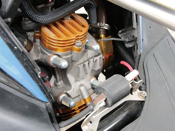一代勁戰從推出上式開始,就引起許多玩家的關注,騎乘穩定度和操控性屢獲佳評。這部一代戰就是在車主熱情之下所衍生的大改車,不同一般的改裝手法,此車可是將原本的畫由系統直接躍升到噴射大改系統。化油器系統進階為噴射系統最大的困難點在於,供油系統的建置、數據撰寫與設定的技術,加上輔以缸體配置大改,就更難掌握引擎動能穩定所需數據量,但藉由艾銳動力控制模組及IMODE監控模組,即時監控與建立供油數據,動力令人讚嘆不已。