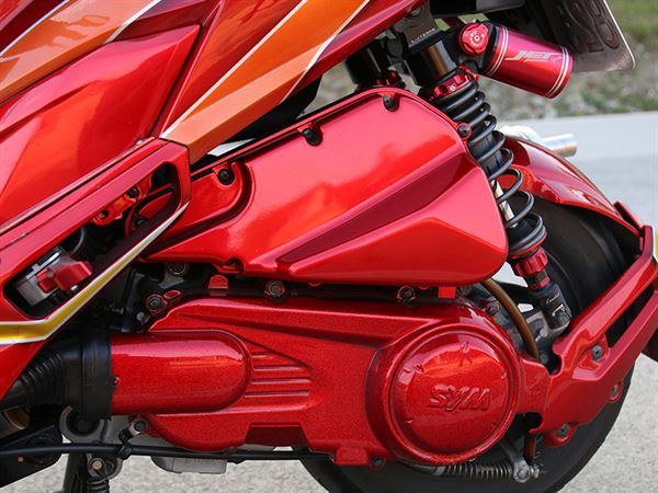 改裝出自己理想的風格是每一位騎士都想達成的目標,在視覺改裝方面條件更是嚴苛,這台改裝Jet Power正是一台擁有濃烈個人氣息的視覺改裝。擁有一身亮紅色的塗裝,加上黃色線條的呼應,前輪採用Gjms ff2的前叉搭配brembo 卡鉗增強穩定性能,加上手工製作的白鐵排氣管增加整體性能以及與外觀呼應,內裝上除了升級配備外,部件也一律烤上了鮮紅色。除了外裝升級之外,還有一個重點是光源的改造,Jet Power的靈魂就是那對鷹眼大燈,加裝魚眼配置幾乎是每一位改裝的玩家必備的光源配置,只要改上了魚眼之後,車子給人的感覺截然不同,十分有殺氣。