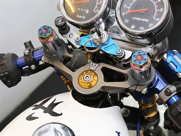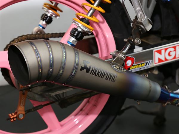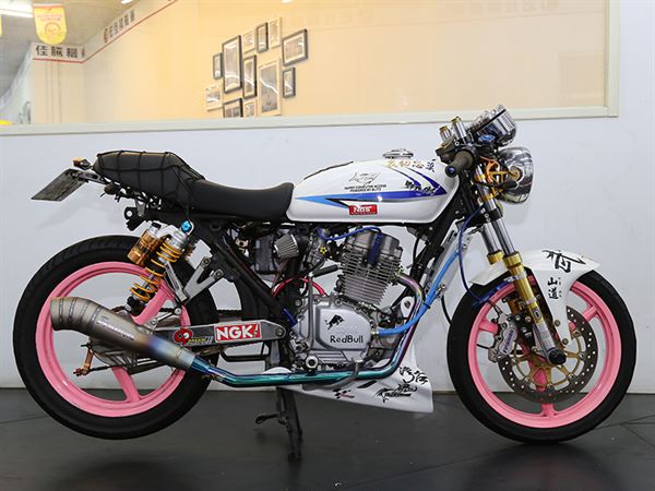 這一台「彩鈦武魂白狼」以整車最亮眼的彩鈦前段蠍子管和粉色烤漆的前後輪框創造出了衝突的美感,禾倉鏤空三角台不但增加車體行走的穩定度以外,對騎士視野也有相當不錯的加分效果。如此緊繃的設定是多麼的讓人熱血蓬勃,希望可以實際騎乘這台野狼一親芳澤,感受它那過人的動態性能的魅力,野狼的基底性能其實已經不錯,強化過後的野狼更有亮眼的表現。