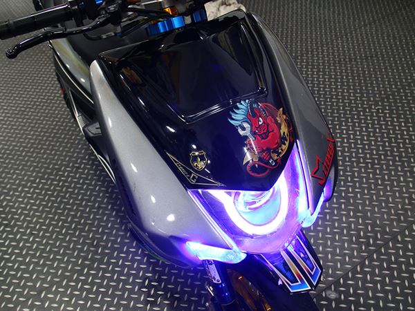 CYGNUS-X 125不管是第幾代都是目前這一世代的改裝首選車輛,而這一台三代CYGNUS-X 125最吸引人注目的為少見的寬體套件,讓CYGNUS-X 125從原有的質感外型變化成肅殺的閻黑鬼神,寬體上方的海神把製造出鏤空的特殊視覺效果,而除了前方的精心改裝以外,車尾部份也是下了相當的心血,正惡魔排氣短管與AUM 恐龍CNC排骨同時給予啞黑與亮金面的衝突美感。