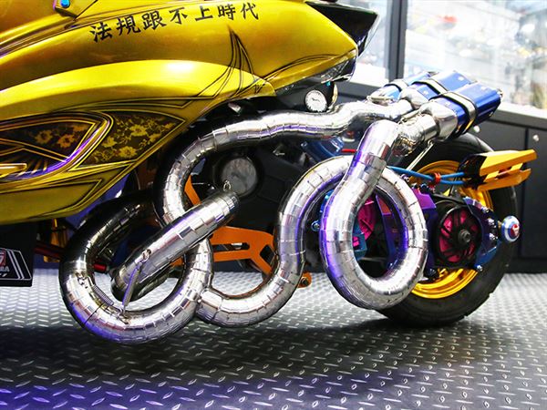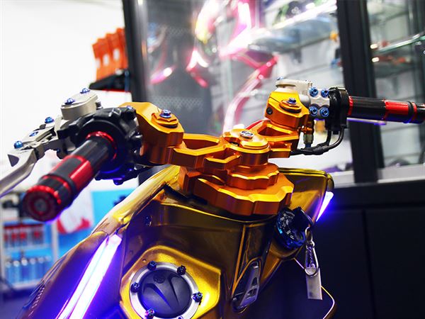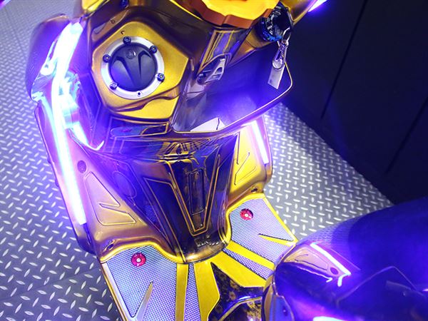 此台CYGNUS-X 125為越旺車業老闆集所有技術資源與極致工藝打造而成的作品,強烈的視覺觀感,極度擴張的車身比例和數不清的手工製作零件,展現出獨一無二的車藝作品。前斜版採用越旺車業開發的寬體套件,前總採用法斯特出品的前雙倒叉避震器,搭配雙對八卡鉗與救世軍煞車碟盤,輪框採用RPM 鍛造框。