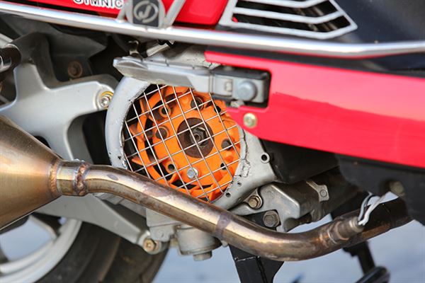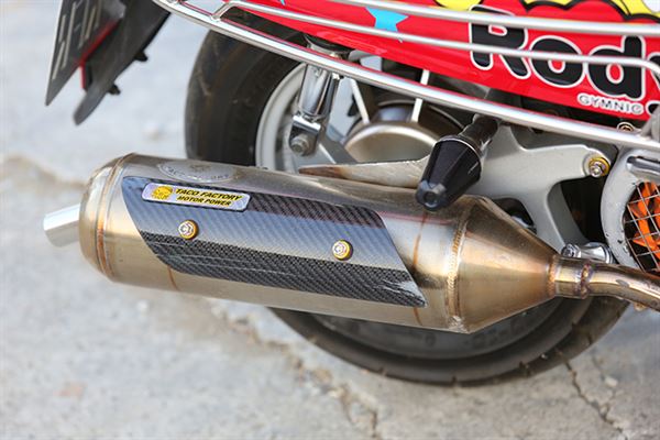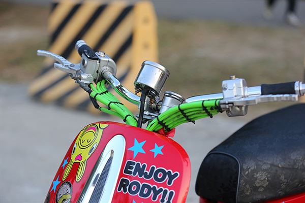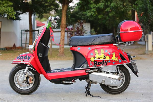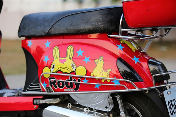 塗裝上表現就是年輕人的活動力。轉頭看向尾翼上的車廂,除了可放置物品外後座的乘客也剛好有安全的倚靠,椅墊部分也製成復古低調的黑色印花,而外觀走向也偏外出郊遊的休閒路線;車主也細心的裝上了防撞桿,減少車體本身遭受到的小碰撞,側向卡鉗的改裝讓制動性能更為提高,排氣管的部分則是選用章魚工廠出品的白鐵管,整體造型表現了青春洋溢的走跳風格。