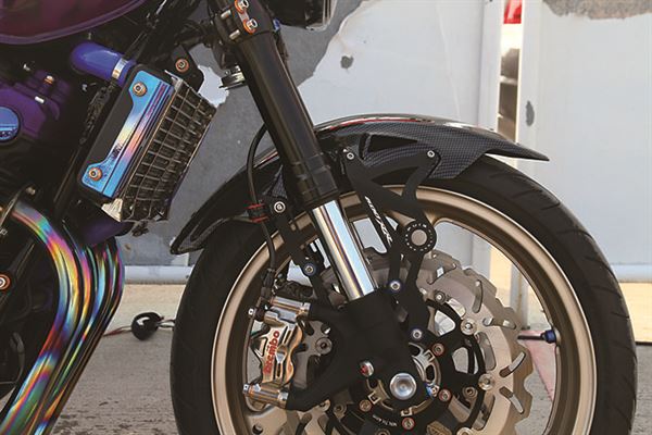 黑色搭配紫色,帶有魔幻風格的塗裝,加上好到無可挑剔的用料,讓所有人對這台CB400忍不住會多看兩眼。前倒叉加上Brembo鍛造對四輻射卡鉗及直推式總泵,完全是比造頂級重車的用料,碟盤也換裝成浪花碟,除了外型更加吸引人外,也強化了散熱效果。