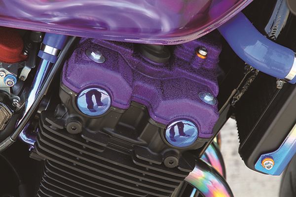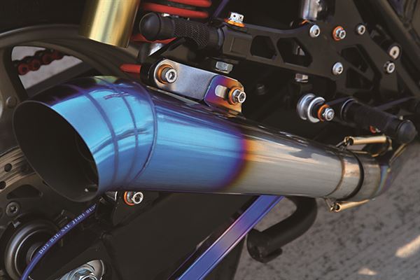 缸頭蓋及化油器上蓋都經過特殊處理,營造出鑄造的粗糙感,排氣管無論前、中還是尾段都是呈現漂亮的彩虹色,再以大量的彈簧固定住各節排氣管,尤其尾段更是仿GP賽車使用喇叭狀設計,再加上經過電鍍處理得曲軸箱外蓋,整顆引擎看起來不再呆板,反而成為了整台車目光集中的焦點。全組腳踏後移讓整台車的過彎傾角更大,從原本的低把改為分離把也讓整台車Café Racer的風格更加到位。