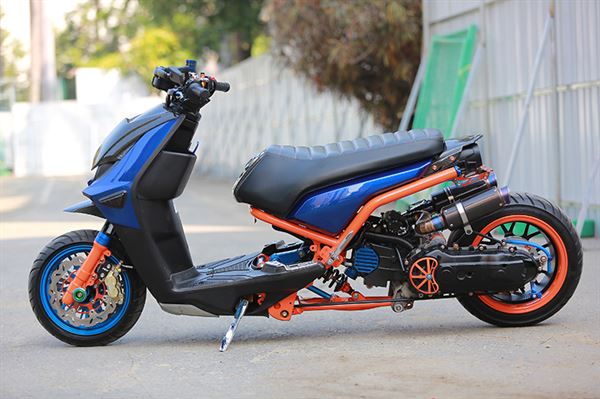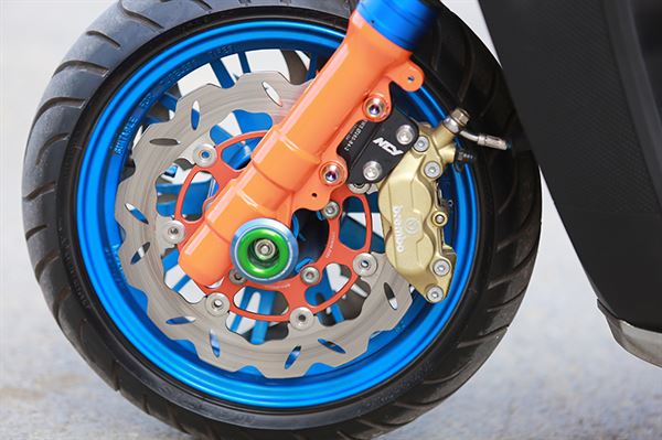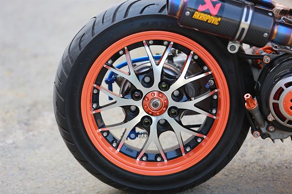 這輛乍看之下看似珠光寶氣的BWS,是來自南區後移家族的車輛,全車後移幅度相當大,所有細部的處理更是讓人驚艷,從車輛下方的中置避震,就可以知道車主對於這輛車的用心程度,搭配上全車近乎柯博文的配色,讓人很難不聯想到變型金剛,也有點類似美國隊長的配色。雙管採用AKRAPOVIC的碳纖維短版,連前段都是特殊的手工作品,後輪則採用肥大的寬胎,搭配上做工精緻的雪花樣式的輪框,輪框上頭還附上許多點綴用的螺絲,讓全車更富有完整感以及機械感,車輛裝上中置避震後,在車輛與引擎的中央,就有一種不協調的感覺,但是看久了之後,卻又覺得有點討喜。