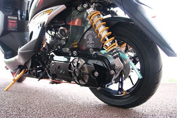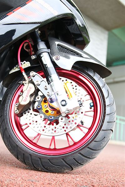 這部勁戰以76-2520DS套件組做為動力升級基礎架構,76缸體搭配2520條的行程,其動力輸出更為暴力張狂,吸睛滿點的並不只有缸體部份,其配合供油作動的大口徑PWK38化油器,其大喇叭進氣喉口對應引擎動力運作毫不遲疑,直接給予騎乘者近似脫疆野馬般動力拉扯暴走,若是沒有幾分實力或信心,千萬不要期望你能帥氣駕馭此車!鯊魚前後鍛造輪圈與DY前避震器和RPM短版避震器的騎乘質感提升,絕對有助於滿足熱血玩家的疾走需求!