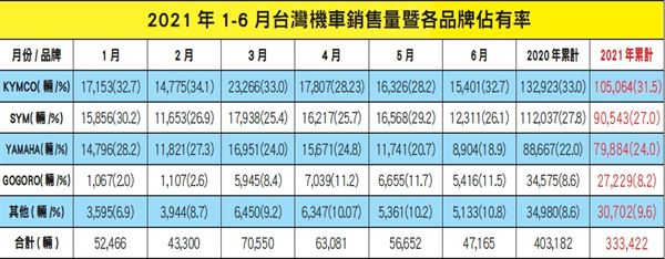 2021年1~6月台灣機車銷售量