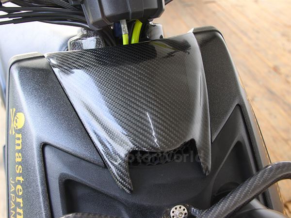 全車外觀採用低調又兼具質感的消光黑金蔥烤漆,並使用大量的Carbon部品做為點綴,包括車頭大燈架和土除,以及整套把手都是Carbon部品,車架以及傳動蓋、風扇蓋也使用Carbon包覆,將全車的精緻感再升級。