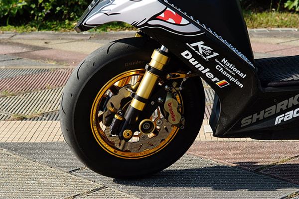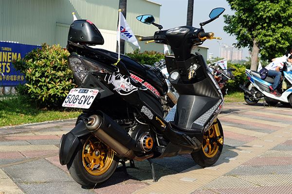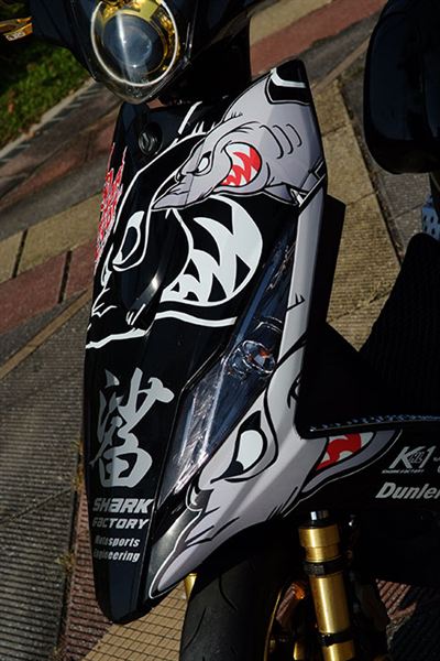 SYM GT125是三陽的長青車款,昔日被定位成買菜車,到今天GT125也成為年輕族群潮流車的其一選擇。在中區也有一群獨鍾GT125的玩家,將GT125的精髓發揚光大。這輛GT125以賽場上知名的鯊魚號為楷模,在車頭兩側部份放上鯊魚頭,後側殼部份則是以線條鯊搭配中型鯊魚,營造都市戰鬥機的風格。前後輪框採用金色電鍍處理,更強化了視覺衝擊效果。看似低調卻又難以忽視的存在,讓這部GT鶴立雞群。