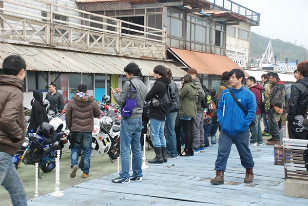 在還沒餐廳吃飯前,車友們聚在外頭互相串門子