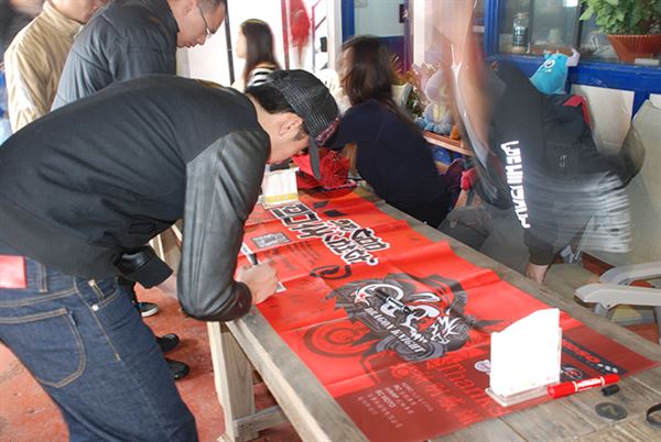 門外的代表隊旗,每位隊員可得要在上面簽上字才算來過