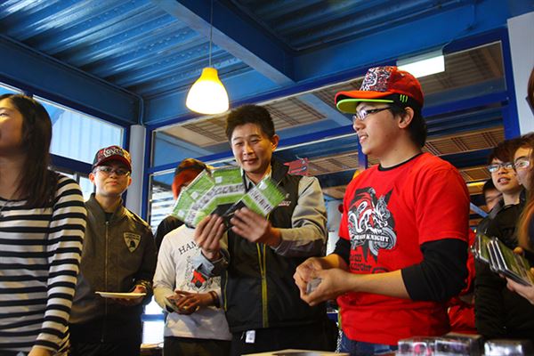 這次不畏風寒,到場參加的車友超過80人,餐廳內則是準備了西式的自助餐供車友取用,現場由會彈吉它的車友伴奏音樂,在大廳中車友一邊吃飯一邊互相交換玩車心得,當然抽獎獎品也相當豐富,包括由KOSO、睿麒車業、武田車業、SCMOTO等廠商提供獎品,最大獎是由KOSO提供的引擎改裝套件,由一位女車友獨得!