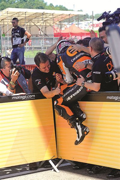 積分第二且在去年義大利站拿下第一場勝利的Marquez,一開始就以最快的速度向前衝,戰勝積分最高的Bradl,且連續兩年在同一個賽場上拿下竿位奪冠的榮耀。