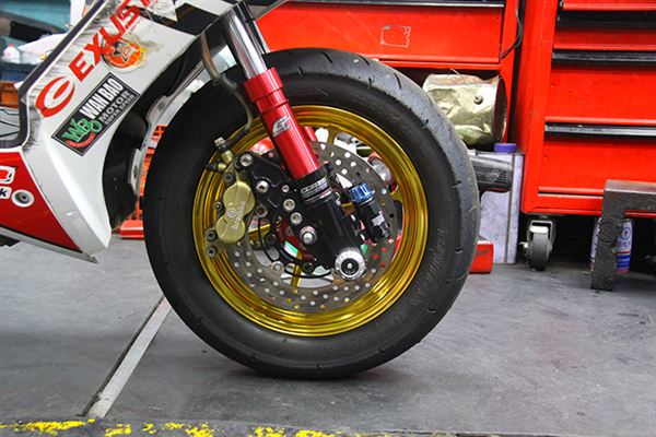 使用GJMS FF3的前叉,再經過車手的使用習慣及重量下去調教,搭配Brembo的對四卡鉗的制動力足以應付比賽