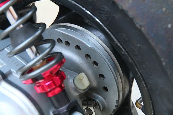 後煞車沿用了原廠的鼓煞系統,改裝較長的煞車搖臂以獲得更大的力矩。另一方面也在煞車鼓上鑽孔,一來減輕些許重量,二來能強化冷卻效果,避免在密集操作下過熱而讓煞車失靈。