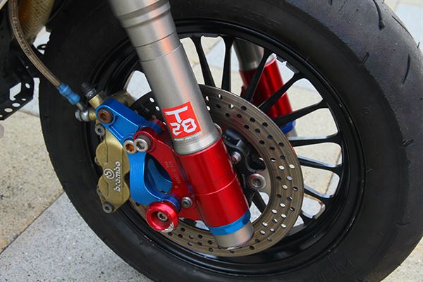 前煞車是Brembo基本款對四卡鉗加上狂熱者浮動碟盤,讓制動效果更為理想。前輪換裝鍛造輪框除了輕量化之外,輪框J值小一點,稱出來的胎型也會尖一點,壓車時車輛傾倒的速度會更快