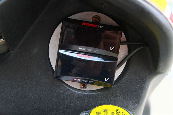 KOSO電壓表可監控電瓶狀況。由於松風的供電分為兩部分,一是車輛行走時的供電,二是水冷系統運作時所需要的電,因此配備的兩組電壓表方便監控