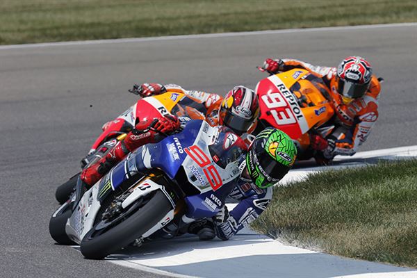 到了第25圈,YAMAHA賽車果然如Lorenzo賽前說的:「在印地賽道上,YAMAHA不是HONDA的對手。」就被Pedrosa直線超越。但這時賽場上的焦點移動到第四名之爭去了,因為先前大幅落後的Rossi已經追到Crutchlow後面,要展開積分第四名的保衛戰了!就在好幾個彎道的攻防之後,到了最後的第27圈,Rossi總算超越Crutchlow,不只是保住第四,還拉開積分差距。就這樣,MOTOGP美國三站都給新人Márquez拿下,積分也領先21分,越來越有問鼎年度冠軍的氣勢了。