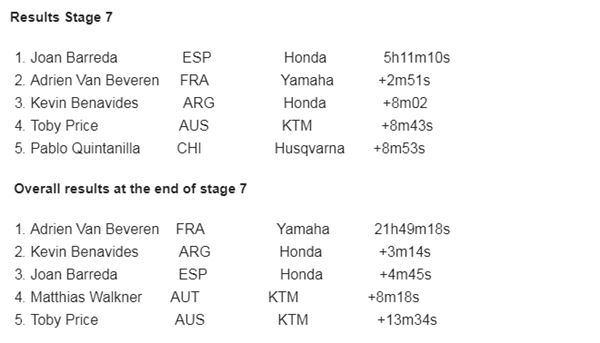 第七關結束後由YAMAHA的法國籍車手Adrien Van Beveren獲得領先,不管對於這位26歲的法國騎士或是YAMAHA都是值得慶祝的一大勝利。
