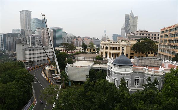 通過葡京彎後的嘉思欄馬路彎,可以看到圍牆外都是繁華的商家