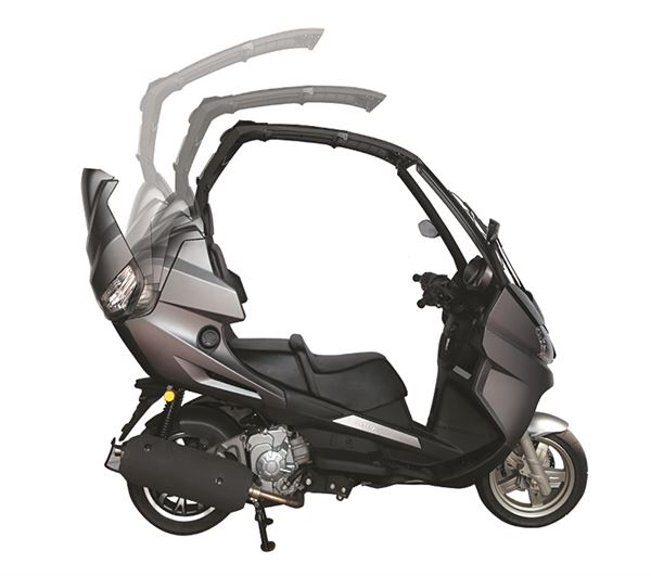 圖/AD2搭載了可收納的伸縮式屋頂,收納方便的屋頂讓騎士能夠輕鬆應對多變的天氣,搭載了兩段式雨刷的檔風鏡完美包覆了車身前側,即便是在雨天也能輕鬆快易的騎乘。