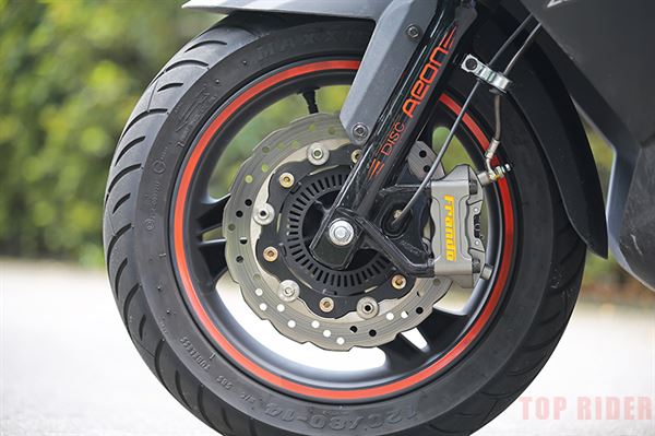 在性能方面最令人注目的是Elite 300R的制動卡鉗為Frando輻射對四卡鉗及前碟升級265mm穿孔浮動碟,大面積活塞搭配加大版穿孔浮動碟盤,提升制動力的同時也擁有更加線性的剎車作動質感。而為了對應此款對四卡鉗,AEON也為300R升級為全新升級可調式拉桿及加大煞車油缸,提供可調整的舒適剎車手感,增加行車安全度。而不只有前制動升級,後碟煞系統也升級至單向雙活塞卡鉗,讓騎士在彎中調控速度更得心應手。最後是全新升級37mm前避震器,優越的支撐性能,提升騎乘時的舒適度與過彎穩定度。