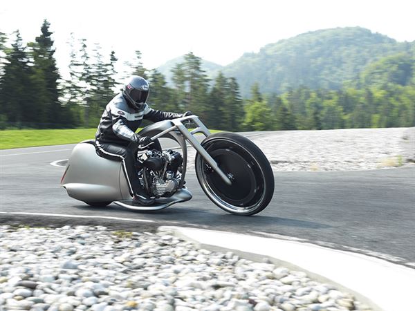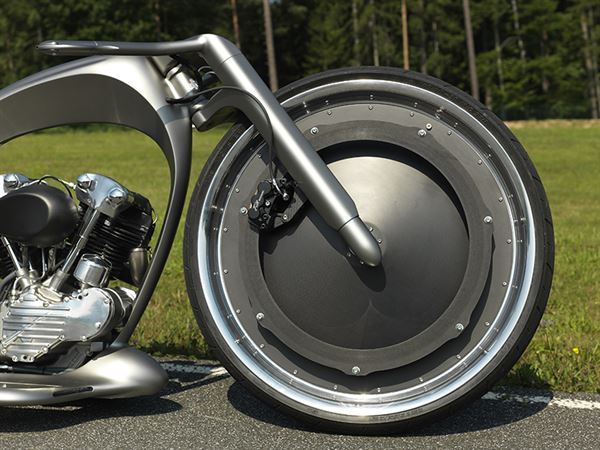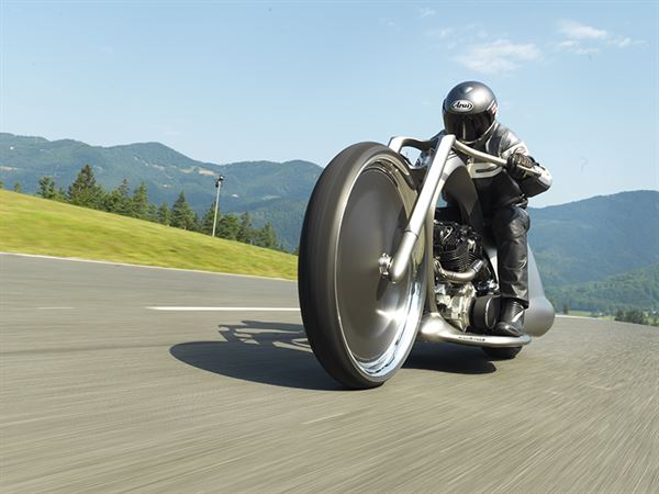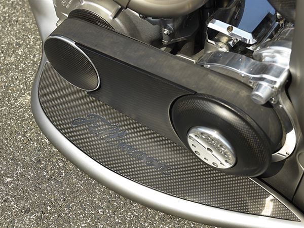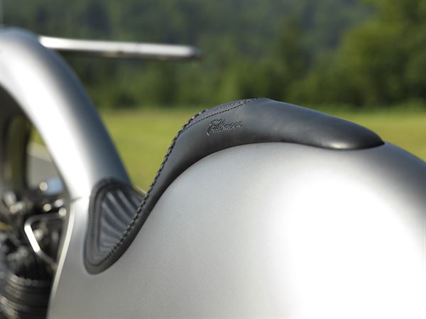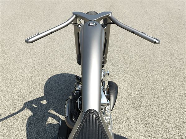 要啟動這顆「史上最好看的美式V缸引擎」(Capuder如此表示),你必須再次將手伸至右腿後方,按下隱藏的啟動按鈕,接下來就能聽到隱沒於車身中的Akrapovič排氣管發出的低沉聲浪。如果你試圖用左腳尋找離合器踏板,你會感到失望-因為那邊根本沒有踏板,優雅後彎的左握把上也不是離合器把手。左握把上其實是從右邊移植過來的煞車把手,為了要移除所有難看的外露線,Capuder發現車手鋼管中的空間不夠容納油門線與液壓煞車線,便將煞車把手由右移至左,同時在右握把上安裝了一個純粹為了好看的把手,完全沒有任何用途。可說是跳脫改裝構思的傳統框架。
