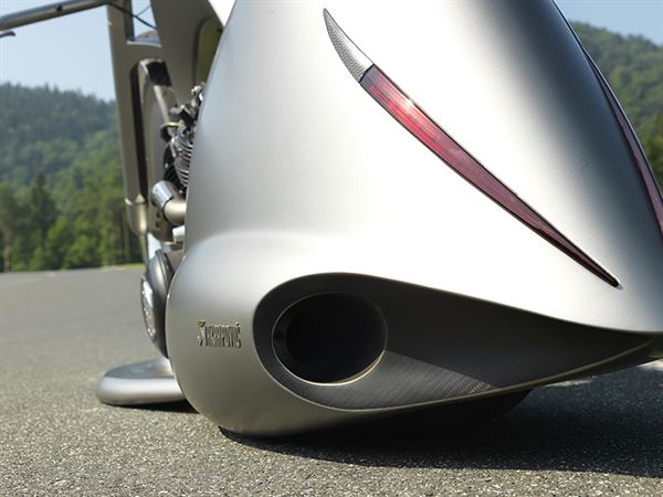 這輛超級機車花了超過800個小時來完成,而他的特色來自於這顆S&S 製1,524 cc的OHV雙缸引擎,配備並聯的Akrapovič特製排氣管。隱藏的單環背脊式車架配上複合式引擎搖籃與融合其中的硬殼油箱,單搖臂與豐腴的外型設計,均是以4130鉻合金打造而成,包括Akrapovič排氣管,使得整部機車就如同Igor Akrapovič所說的,基本上就是一根如假包換的排氣管。「我們想透過創造更勁爆、外型更緊繃的機種,延續在Morsus上成功的客製排氣管宣傳活動」Igor說道,「在這個市場中,你必須持續發表外表新穎且獨特的東西,此外我想要支持我們斯洛伐克當地的改裝王Tomaž Capuder,他技術非常純熟且想像力豐富。Full Moon已超越我們原先的預期-當我們拿這部與Rossi或Lorenzo的Yamaha廠車以及Kawasaki或Ducati的超跑共同展出時,大家通常聚焦在Full Moon,對於與我們合作的世界冠軍機種反而較少關注。」