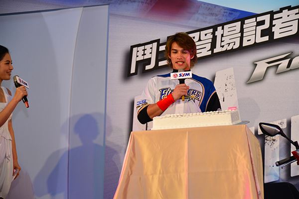 穿著日本火腿鬥士的1號球衣,扛著球棒的陽岱鋼由棒球主播徐展元介紹,在乾冰噴煙中帥氣登場,這不是哪個棒球比賽的開場儀式,而是當天SYM Fighter 代言記者會的開場。