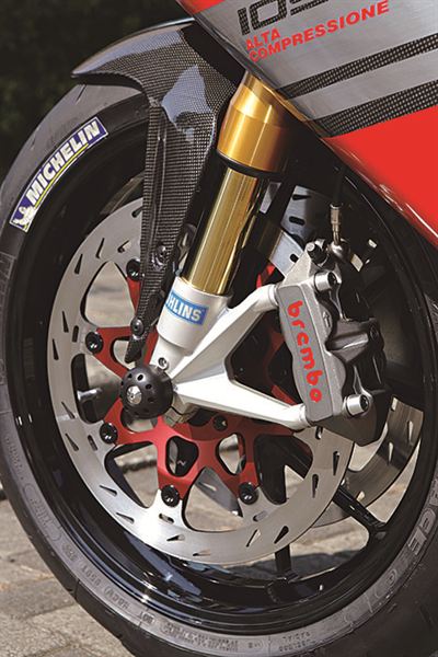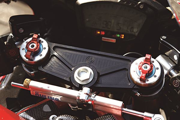 輪軸及輔助架框(幾乎全部都被整流罩給遮住了),也因為粉體塗裝的施工增添了不少光芒。車主未來更計劃變更橋接器軸承套件,如果使用選配的可調式轉向軸承,將可在27~33mm之間的範圍內進行偏差量的調整,更進一步享受1098的操控感受。