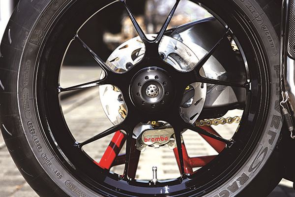 輪框以粉體塗裝工法再次施色,這可是Brembo與ALTH碟盤結合的賽跑車後輪煞車套件。