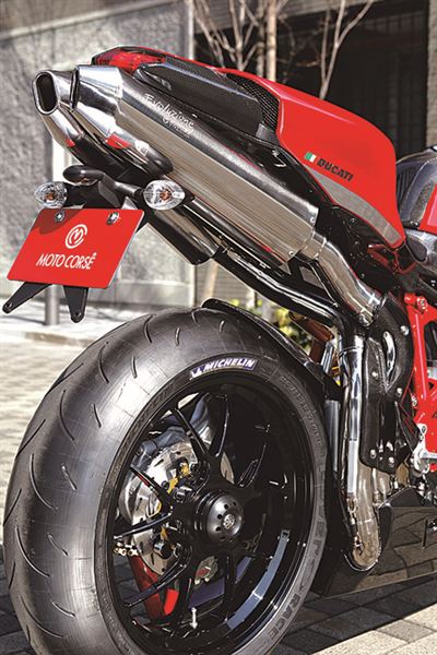 正式踏入社會領到的第一年獎金,便買下這台心儀已久的DUCATI 1098AC,為了讓車子更個性化,車主開始著手改裝。或許它給人的第一印象有點「過於成熟」,但是這就是不斷追求超高品質及賽跑車規格的「MOTO CORSE流」超級跑車1098AC。基本上外裝零件全都更換為碳鋼纖維製品,但在通風口部位及側邊的品牌Logo依然保留碳鋼纖維原色,這種隨意揮灑的主張也突顯出成熟男人的風格。