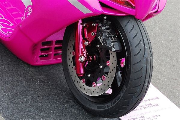 左右換成BREMBO的煞車,選用特製的分離把,配色也相當大膽