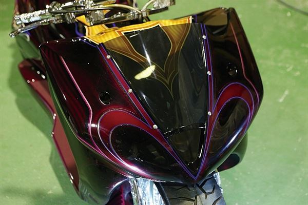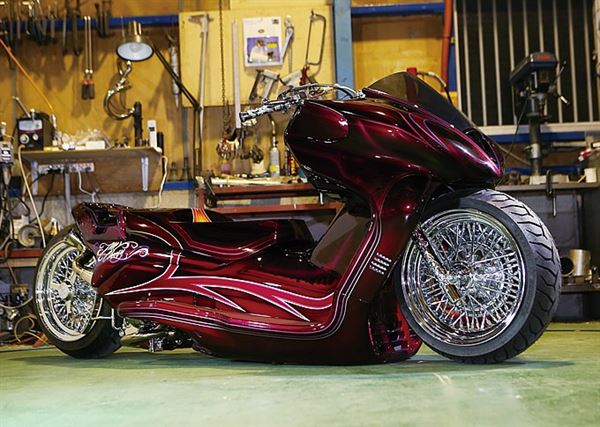 以妖艷的櫻桃色塗裝和圖騰重新打造的HONDA FORZA,FRP造型加工所帶出來的雕刻質感更是不能錯過的一點,車頭加裝DUCATI的風鏡,點綴出侵略風貌