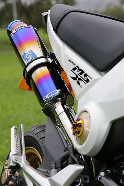目前時下最流行的視覺系風格車款可說是YAMAHA BW’S125了,而MSX正是與BW’S有著類似的風格氣息,偏向滑胎的車輛外觀,視覺上相當搶眼,並且在這樣的騎乘三角設定下,有著相當容易的操控性。MSX原廠便有著如同改裝品般精緻的倒叉以及10爪樹枝框,而車主特別引進國內新興代理的日本改裝排氣管TSR,與車尾配合的天衣無縫的角度,便能看出為此車量身打造的設計感。而其改裝尾燈正是目前風靡於BW’S車系的改裝品,全台唯一、手工改裝而成。