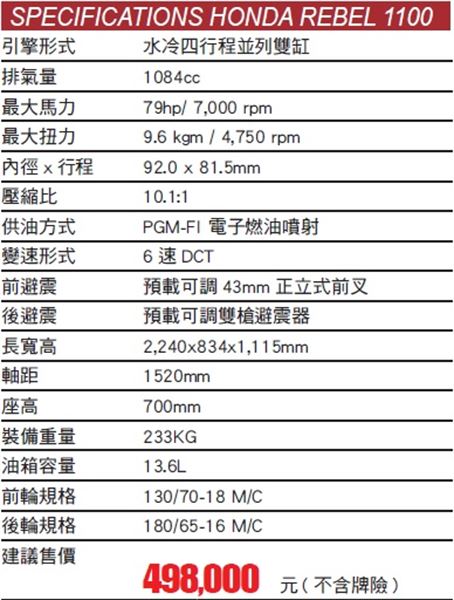 雖然外觀延續REBEL家族的樣貌,全車頭尾的細節仍然存在著巨大的差異。首先是夾在前叉間的頭燈,四入式LED頭燈組加上魚眼折射,看似與 500無異,兩旁多了兩道弧形導光日行燈,凸顯REBEL 1100的科技質感;至於兩旁方向燈外圈同樣保持著導光設計,在黑暗中更具存在感,提升安全性。輪組方面採取了前18後16吋的胎圈設定,扁平比也明顯降低,以獲得更好的操控感與高速穩定性。為維持簡潔俐落的Bobber本色,REBEL 1100採取前單碟設定,330mm大尺寸盤徑搭配上輻射對四卡鉗也確保制動性能可匹配上79hp@7900rpm、9.6kgm@4750rpm 的動力。