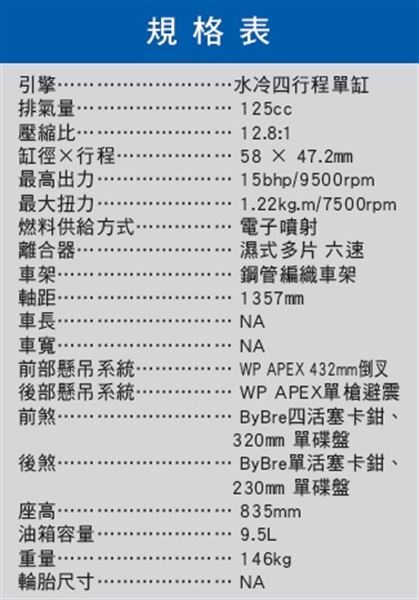 由Bajaj打造的水冷濕式油底殼引擎具有一體成形的鍛造曲軸軸套、加上滾珠軸承,搭配鍛造鋼鐵連桿,帶動輕量化鍛造三環活塞,在進行Nikasil塗層加工過的汽缸內運作,7500rpm時可以產生最大1.22kg-m的扭力,鍊條驅動的雙頂置凸輪軸驅動側邊搖臂來開關汽門,還有單個由齒輪作動的平衡器,就算拉轉到極限11000rpm也沒有多餘的震動。BOSCH ECU控制了整個油門噴射,採用單汽油噴嘴,朝著46m m的節流閥內灌入油氣。整個加速感受是非常的直接與順暢。