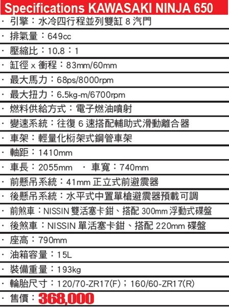 既然訴求輕鬆騎行,NINJA 650自然不只著墨在動力輸出上,輸出特性才是亮點所在。68匹最大馬力以及6.5kg-m的最大扭力雖然在帳面看來並無特別突出,不過在產品定位下原廠將動力帶下修,讓最大扭力在6,700轉時就可達到,最大馬力也緊接著在8,000轉時湧現,讓騎士不需要檔檔高轉依然有充沛的動力,無論在走走停停的市區或是中低速域居多的山道都能應對自如。